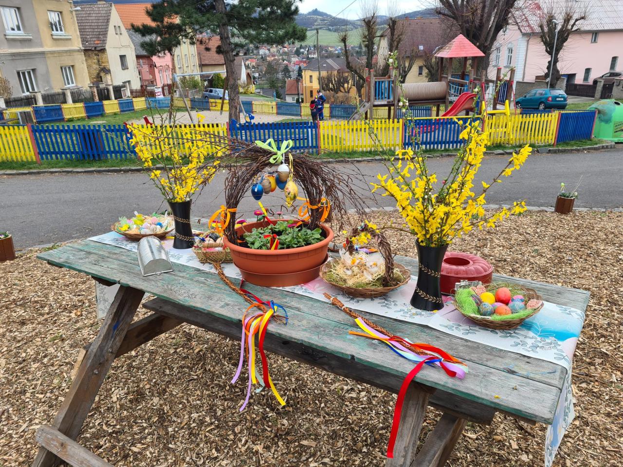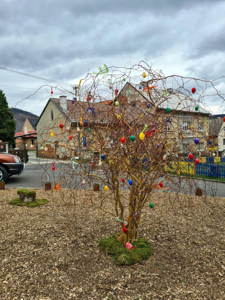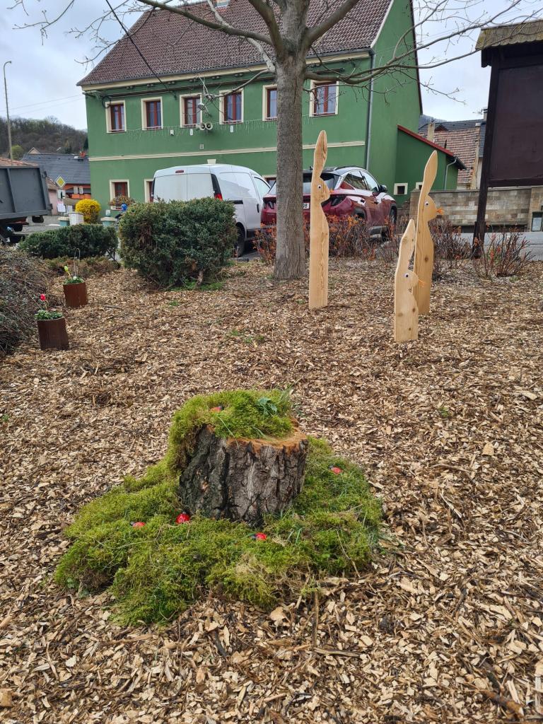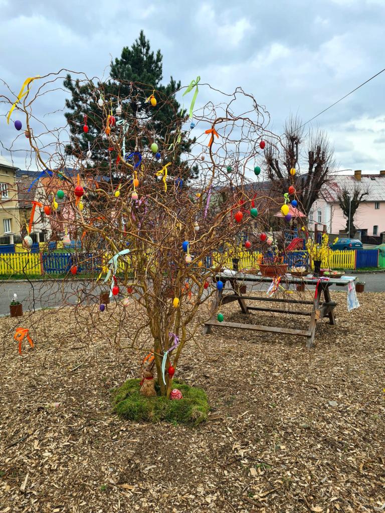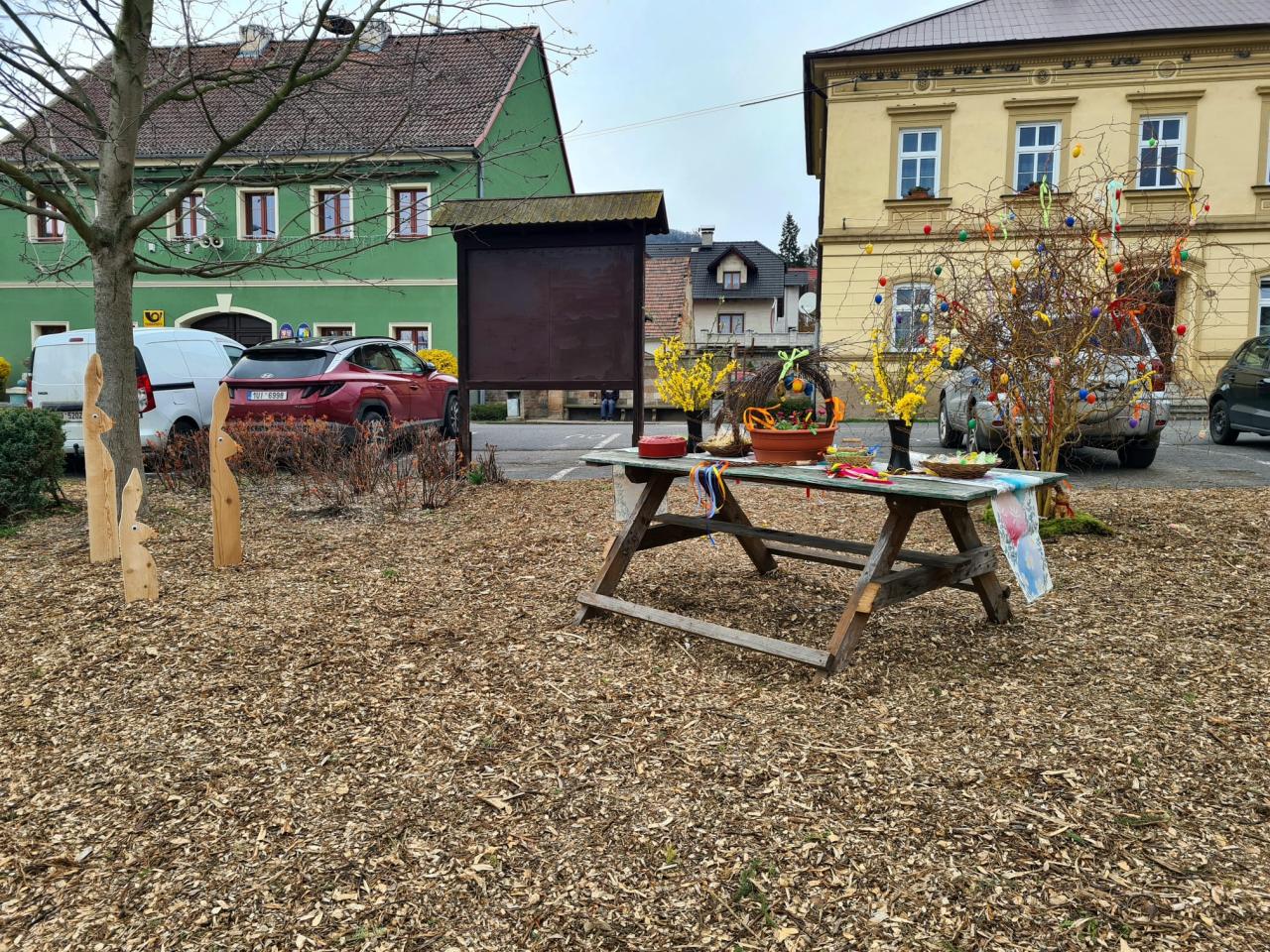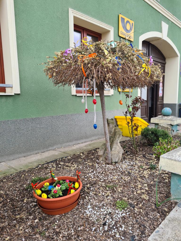 Velikonoční výzdoba obecního úřadu a parčíku na návsi