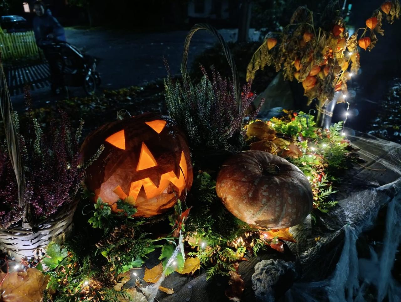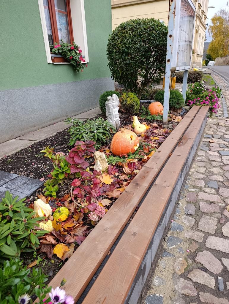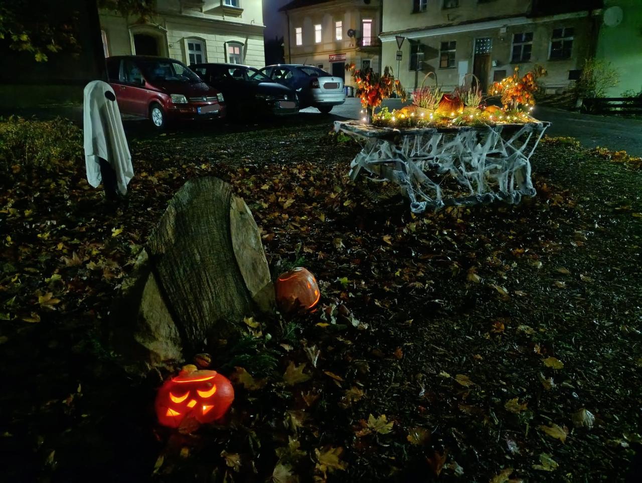 I letos členové kulturní komise nazdobili parčík a předzahrádky obecního úřadu do podzimních a halloweenských odstínů.