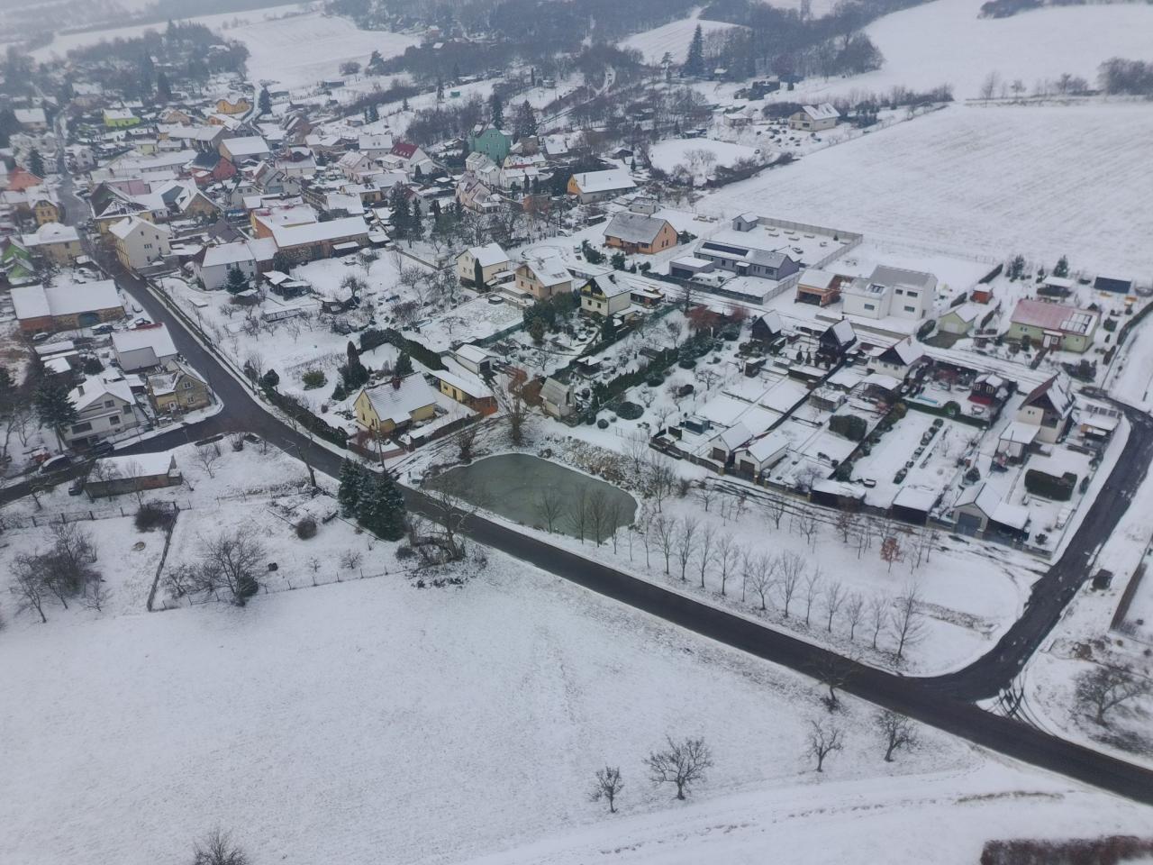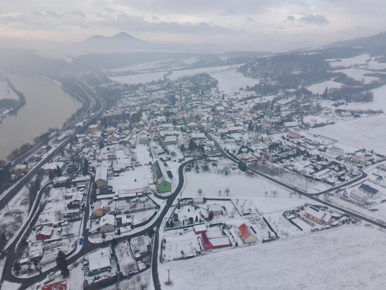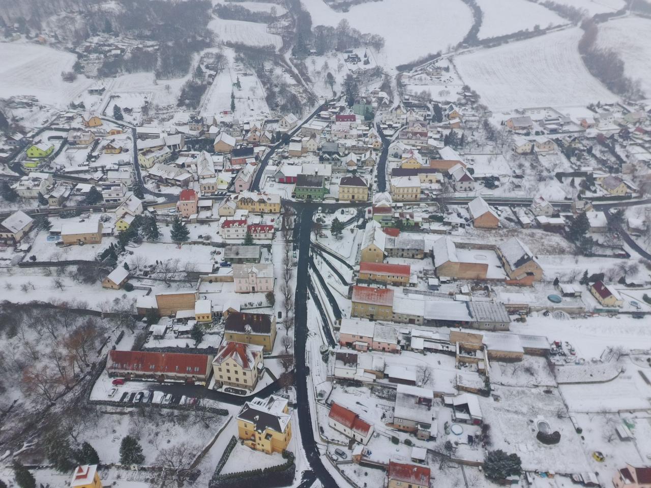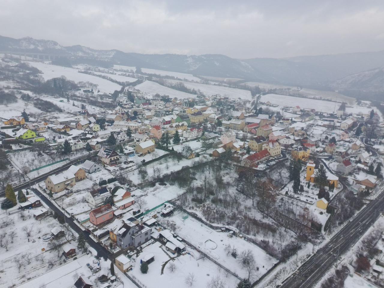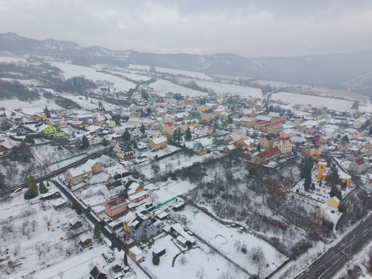 Pohled na zimní Prackovice z ptačí perspektivy.
