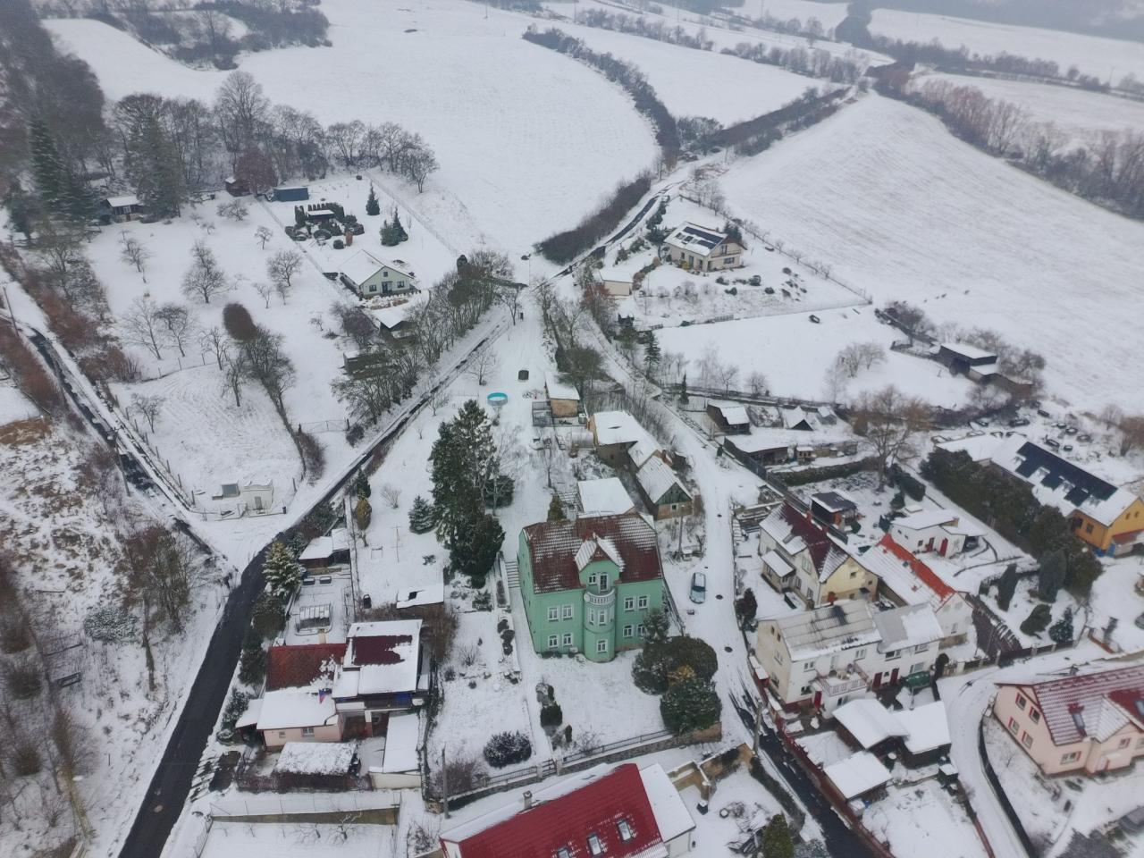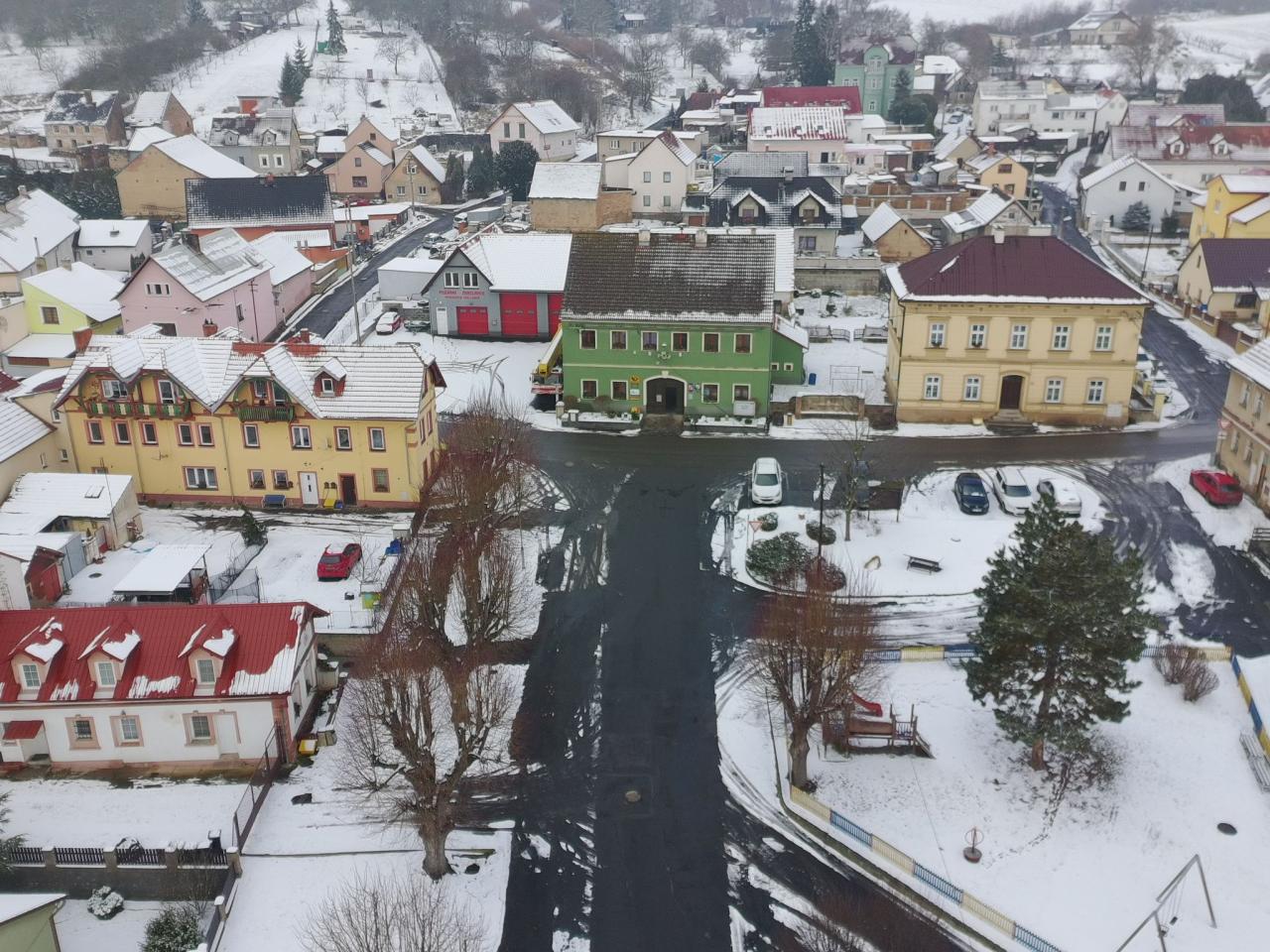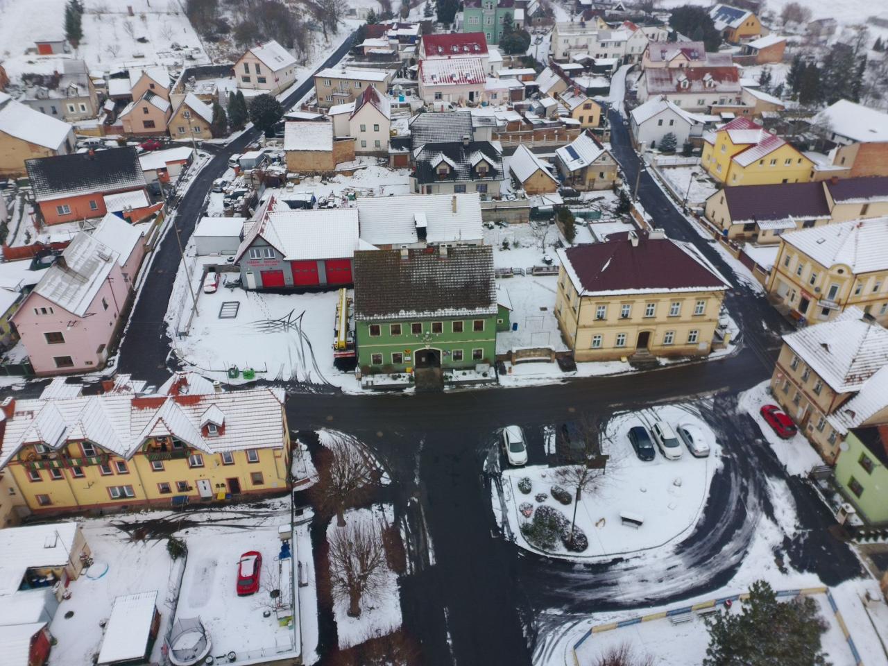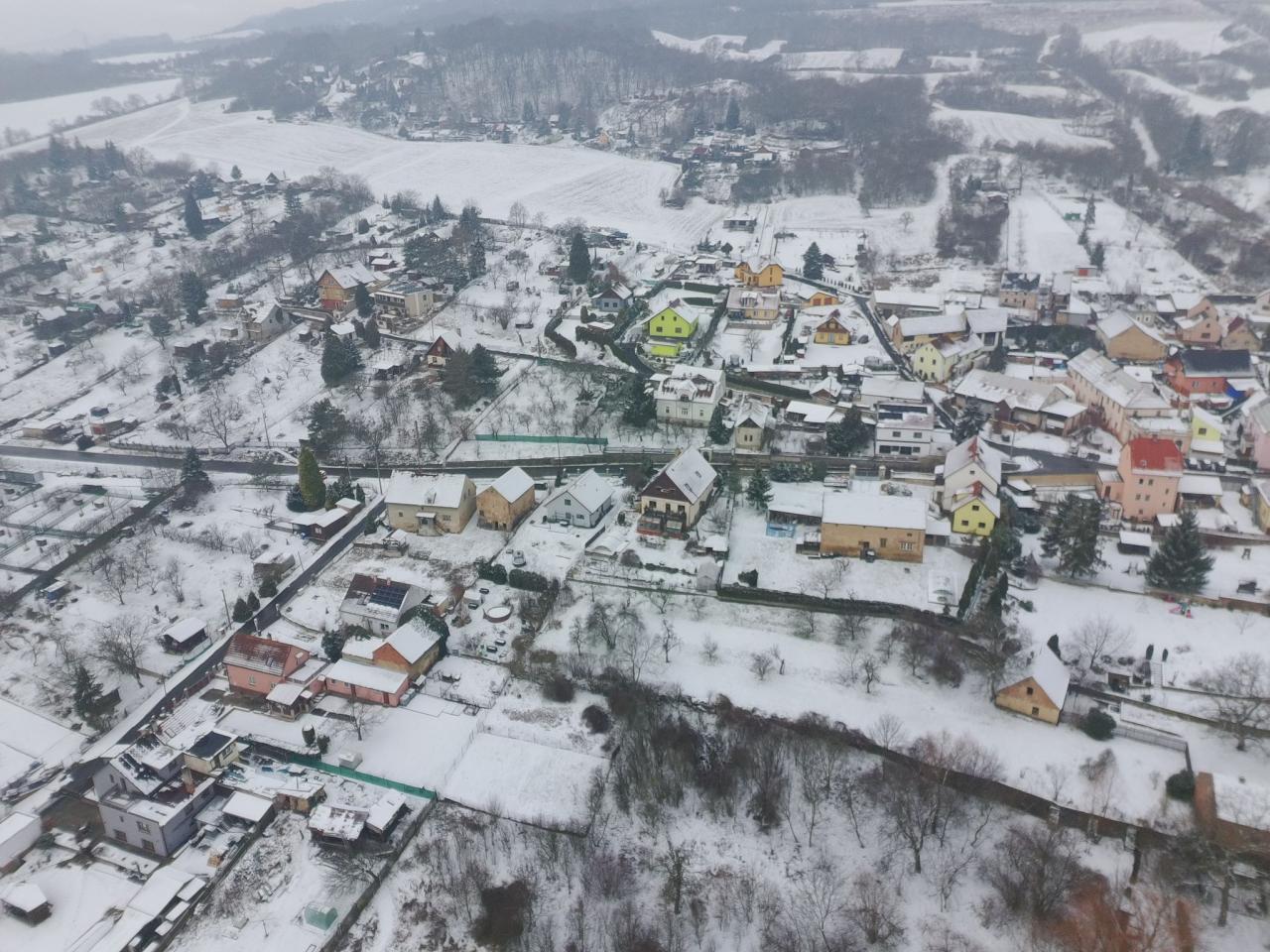 Pohled na zimní Prackovice z ptačí perspektivy.