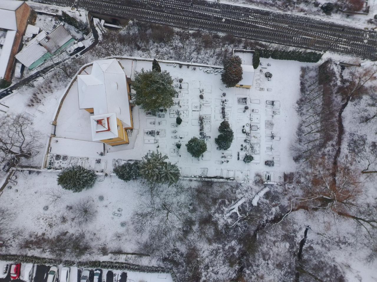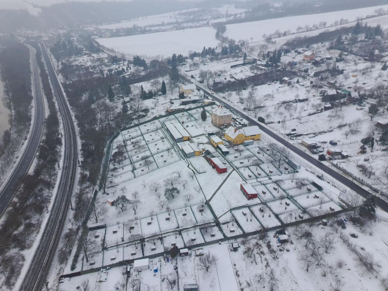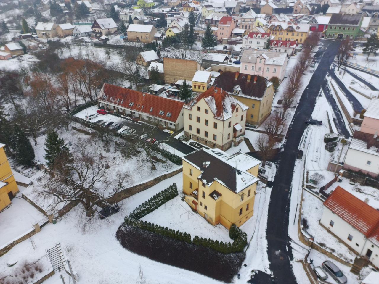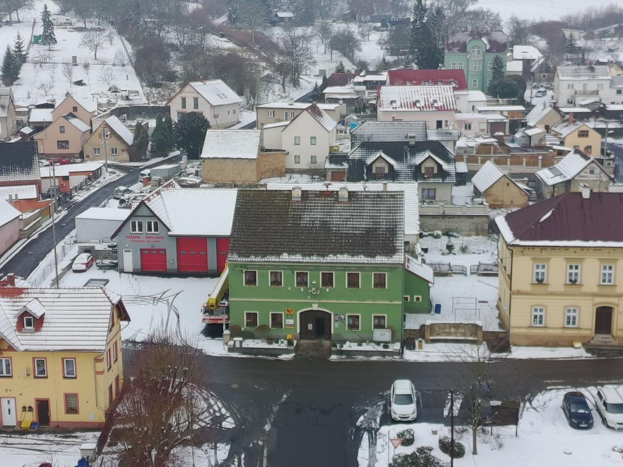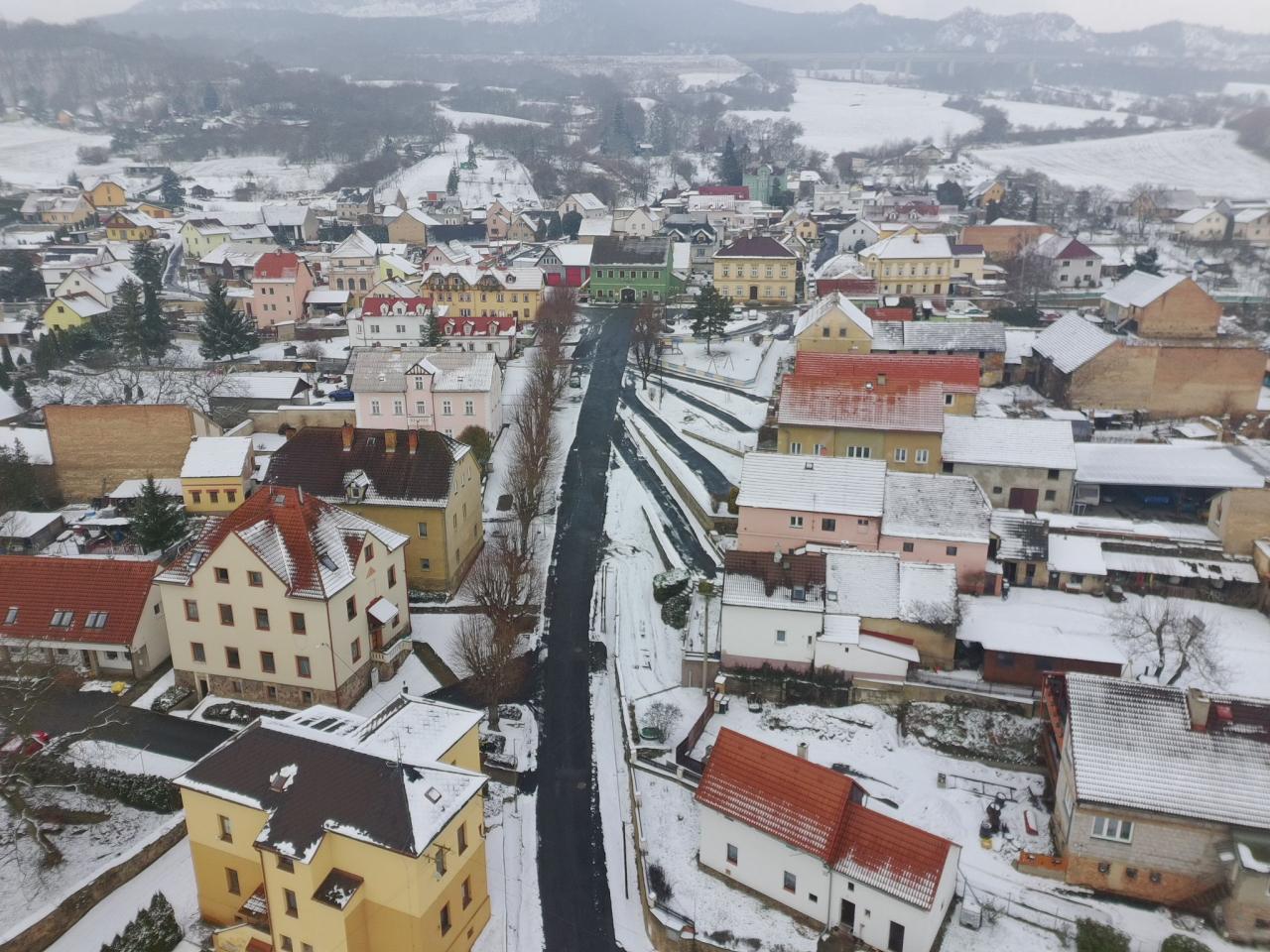 Pohled na zimní Prackovice z ptačí perspektivy.