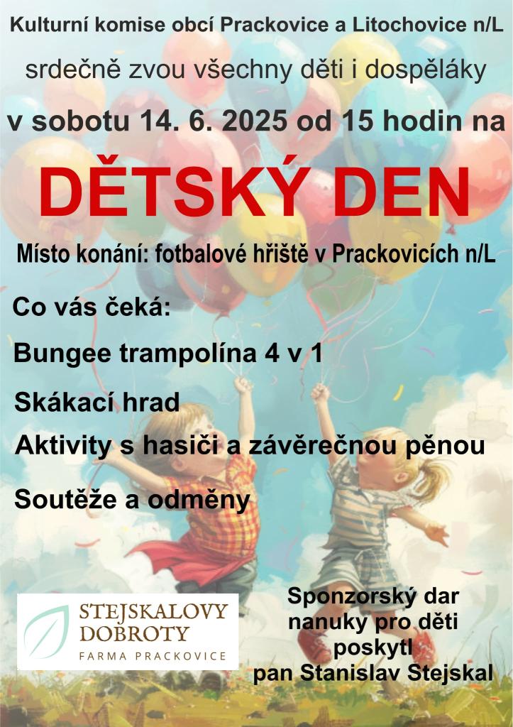 Srdečně všechny zveme na Dětský den, který se bude konat v sobotu 14.6. od 15 hodin na fotbalovém hřišti v Prackovicích.