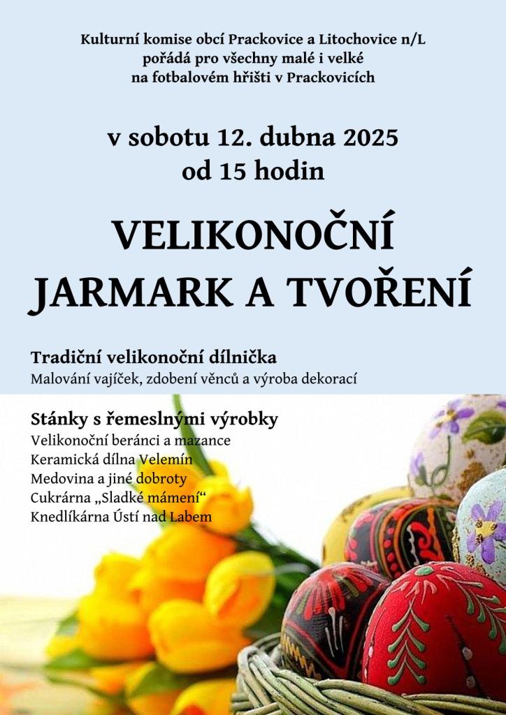 Kulturní komise obcí Prackovice a Litochovice n/L pořádá na fotbalovém hřišti v Prackovicích v sobotu 12. dubna 2025 od 15 hodin Velikonoční jarmark a tvoření. Užijte si malování vajíček, zdobení věnců a výrobu dekorací, spolu s ochutnávkou medoviny a dalšími dobrotami.